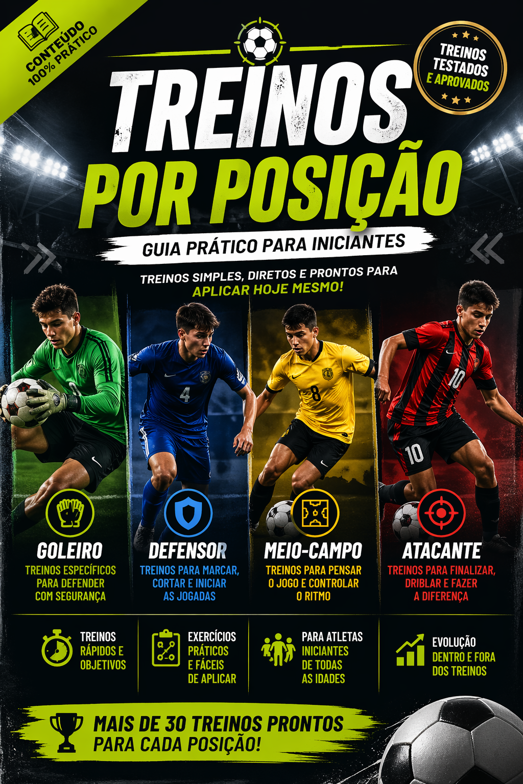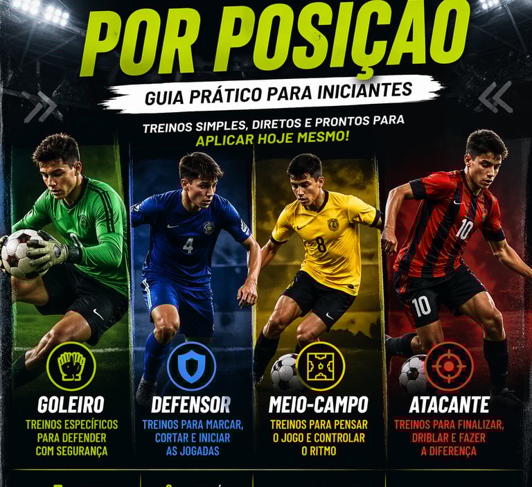 Aprenda na prática como treinar goleiro, defensor, meio-campo e atacante com exercícios simples, organizados e fáceis de aplicar.